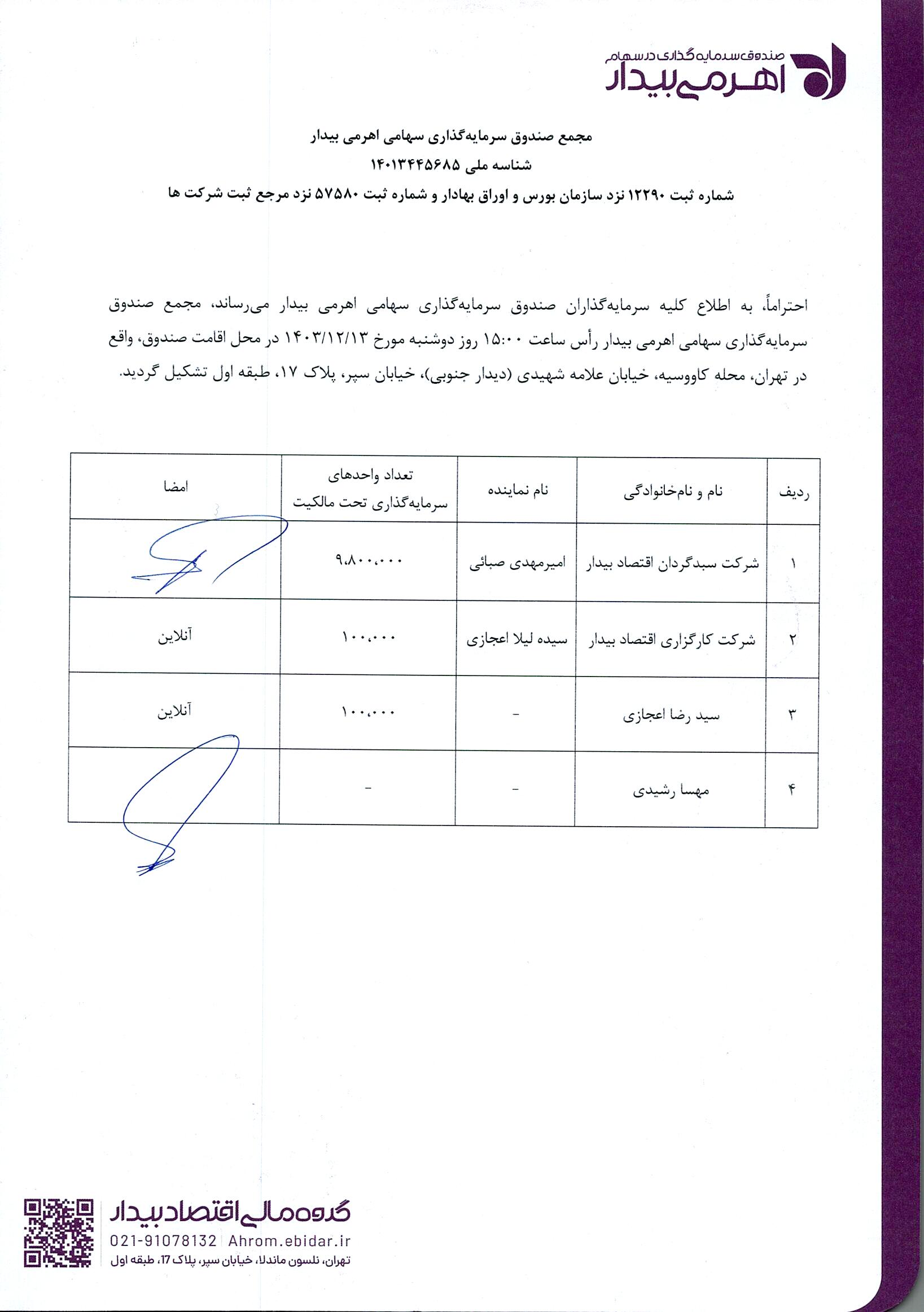 صورتجلسه مجمع صندوق سرمايه گذاري سهامي اهرمي بيدار مورخ 1403.12.13 ( اصلاح بند ب ماده 29 اساسنامه)