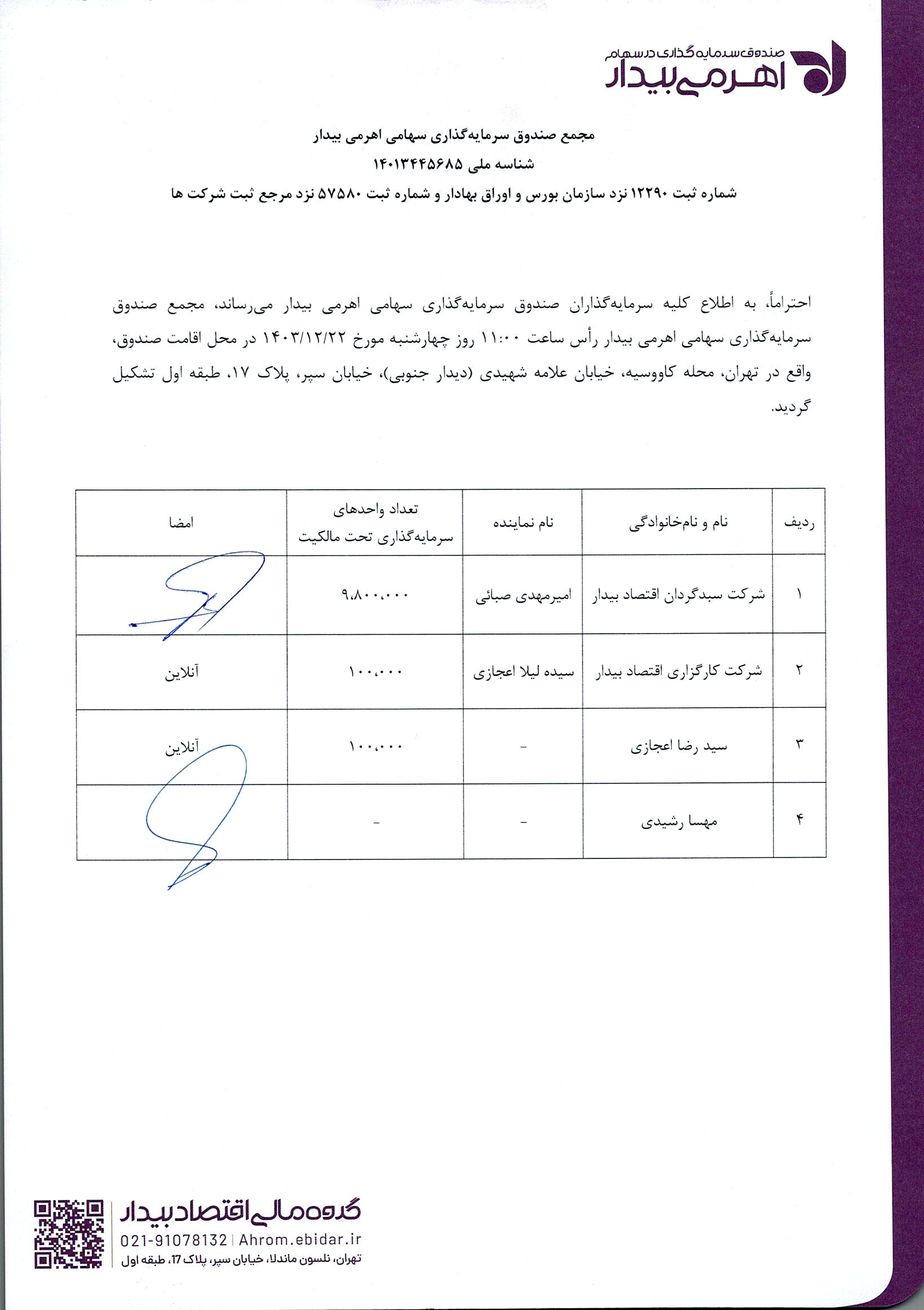 صورتجلسه مجمع صندوق سرمايه گذاري سهامي اهرمي بيدار مورخ 1403.12.22 ( تغییر کارمزد مدیر صندوق)
