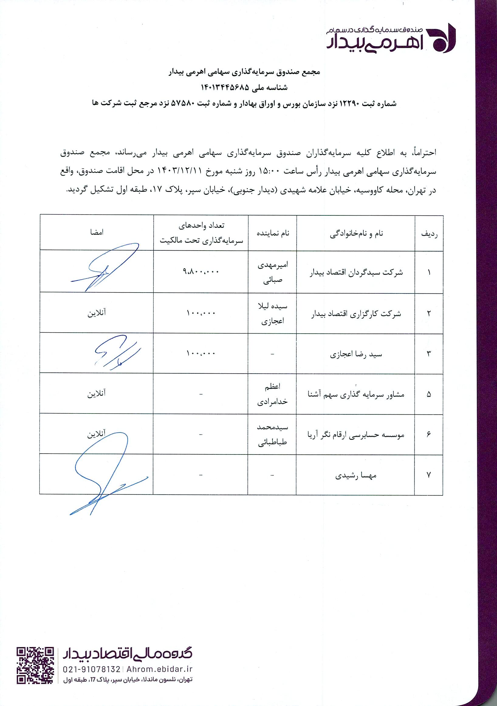 اسامی حاضرین مجمع صندوق سرمایه گذاری سهامی اهرمی بیدار مورخ ۱۴۰۳.۱۲.۱2