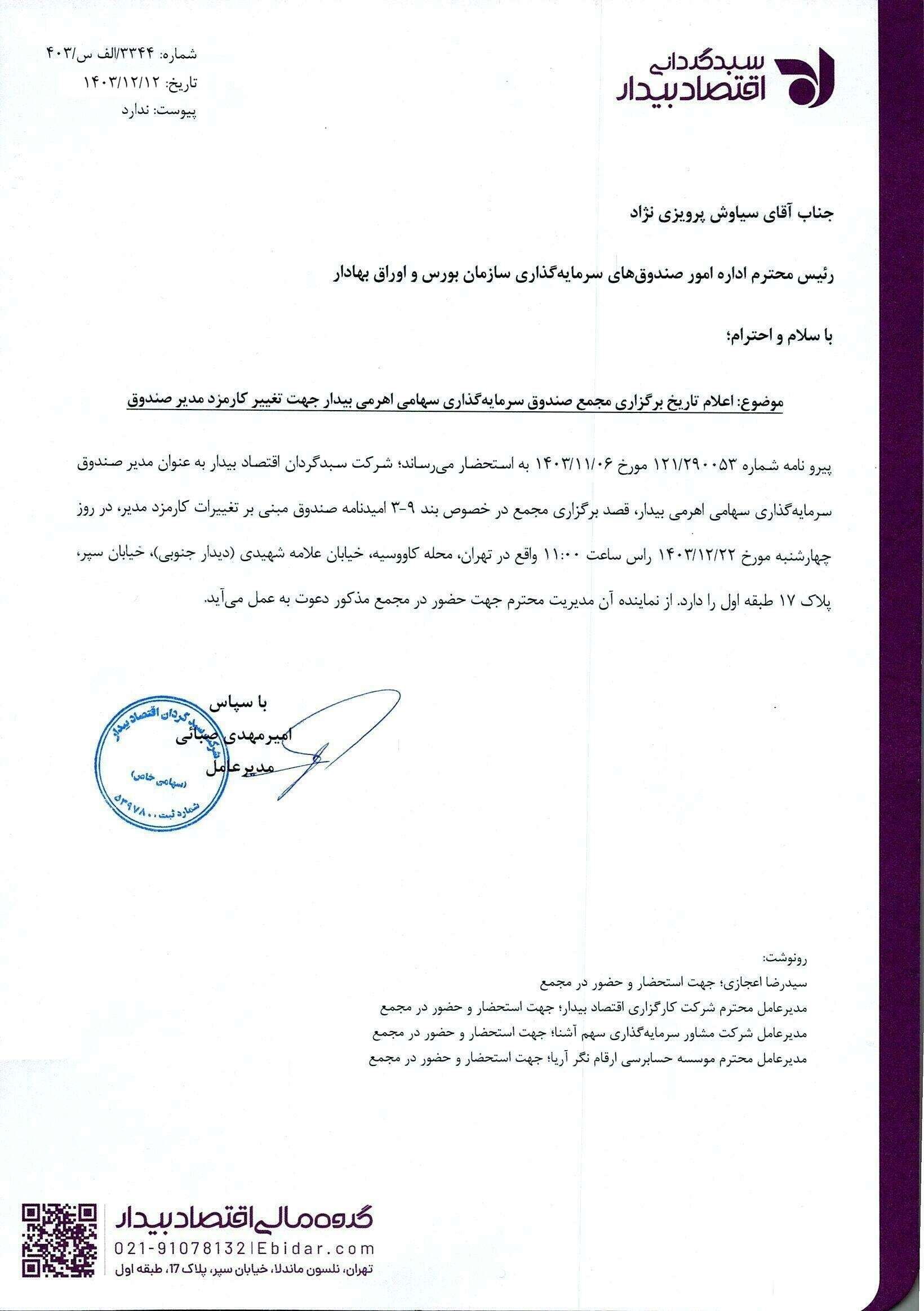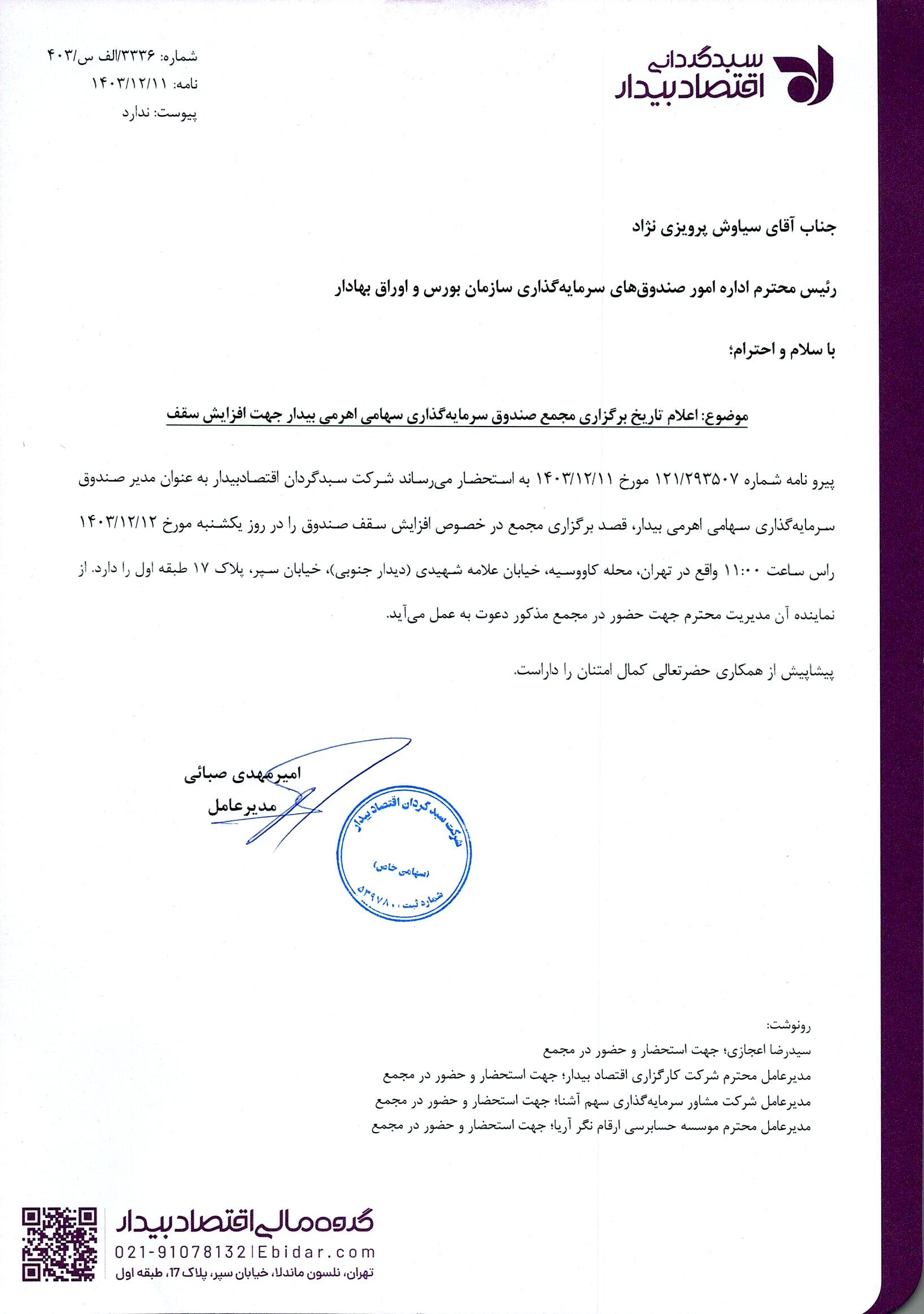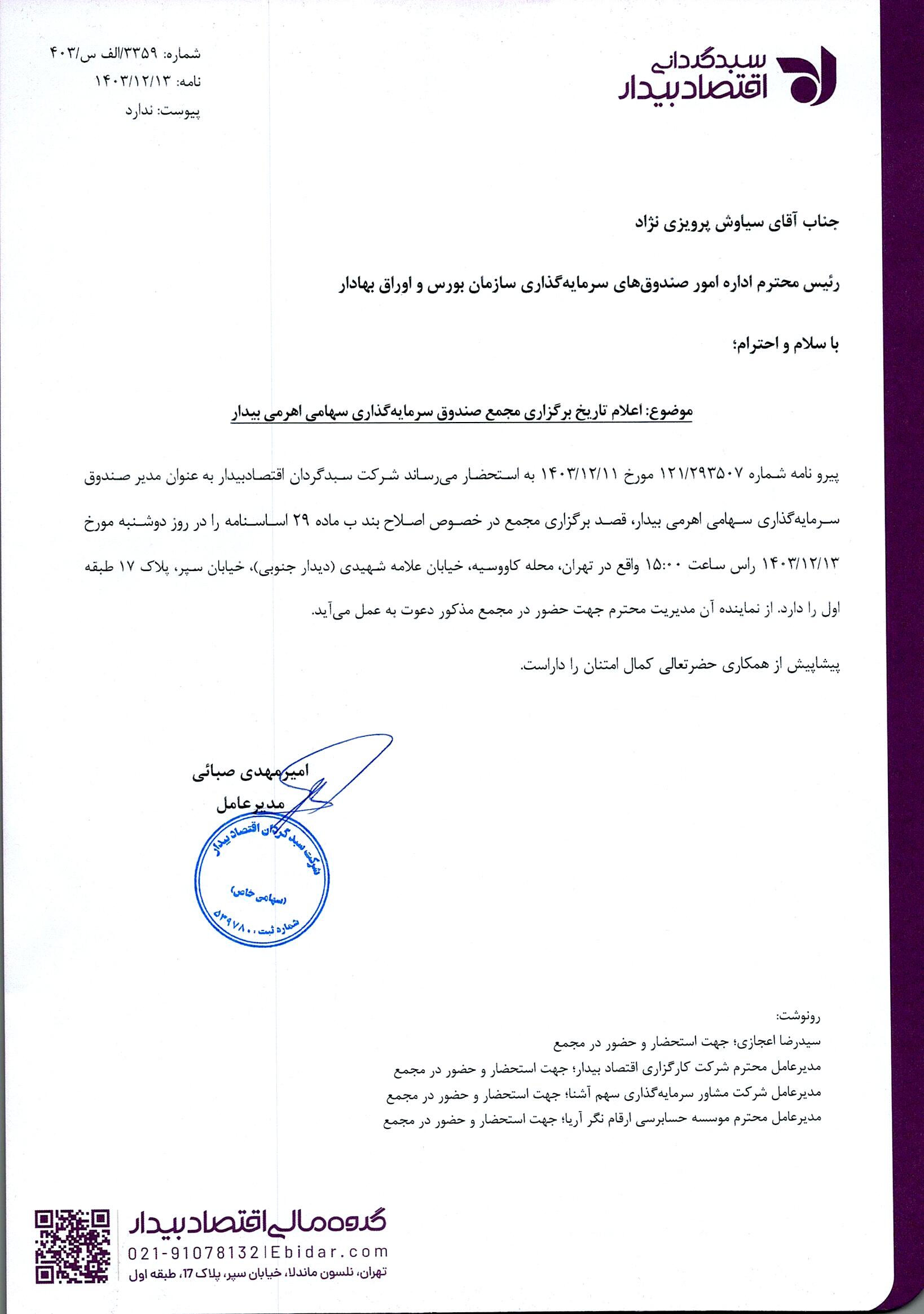 اعلام تاریخ برگزاری مجمع صندوق سرمایه گذاری سهامی اهرمی بیدار مورخ 1403.12.12