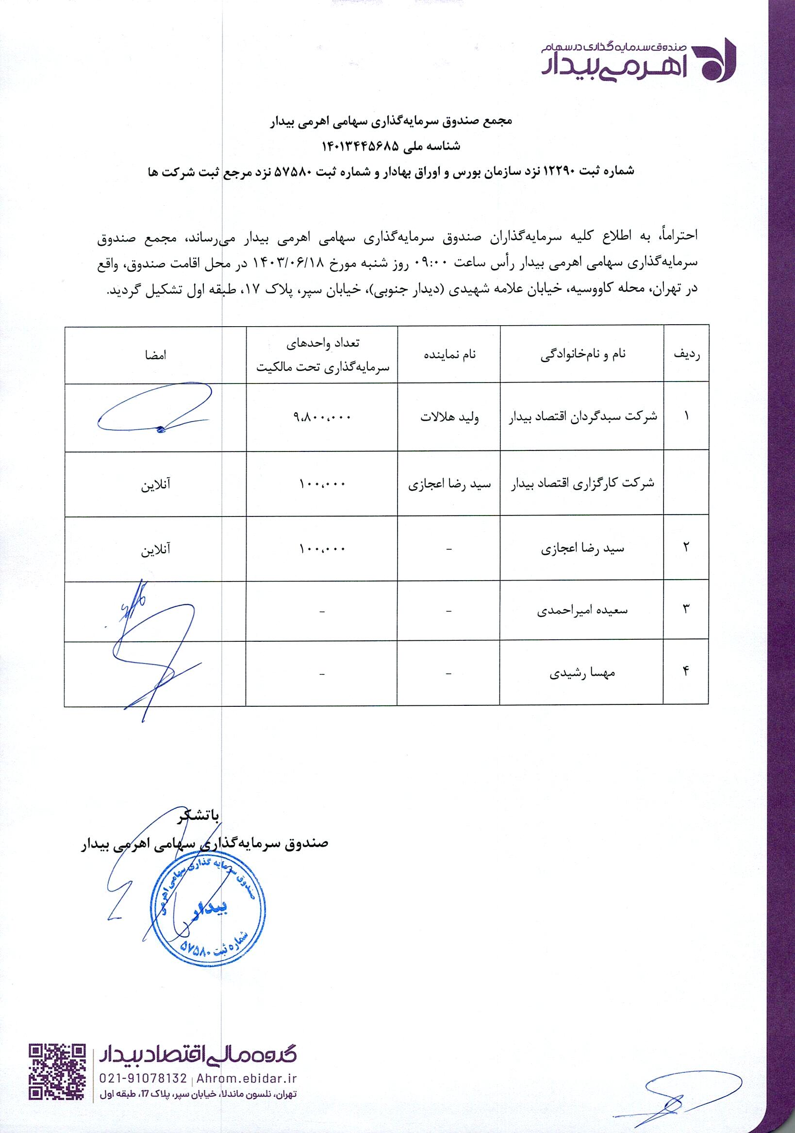 اسامی حاضرین مجمع صندوق سرمایه گذاری سهامی اهرمی بیدار مورخ 1403.10.09