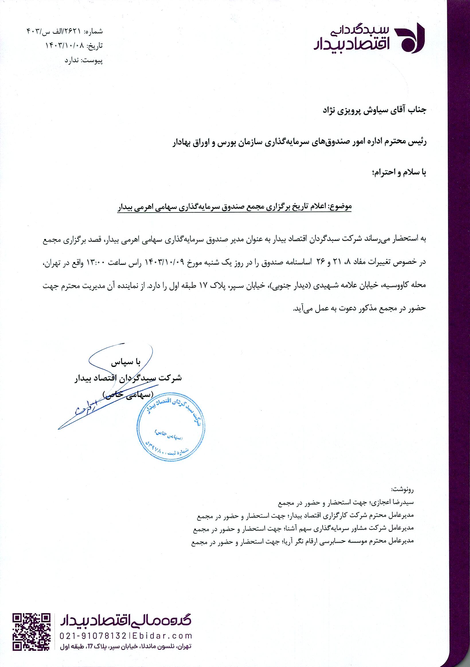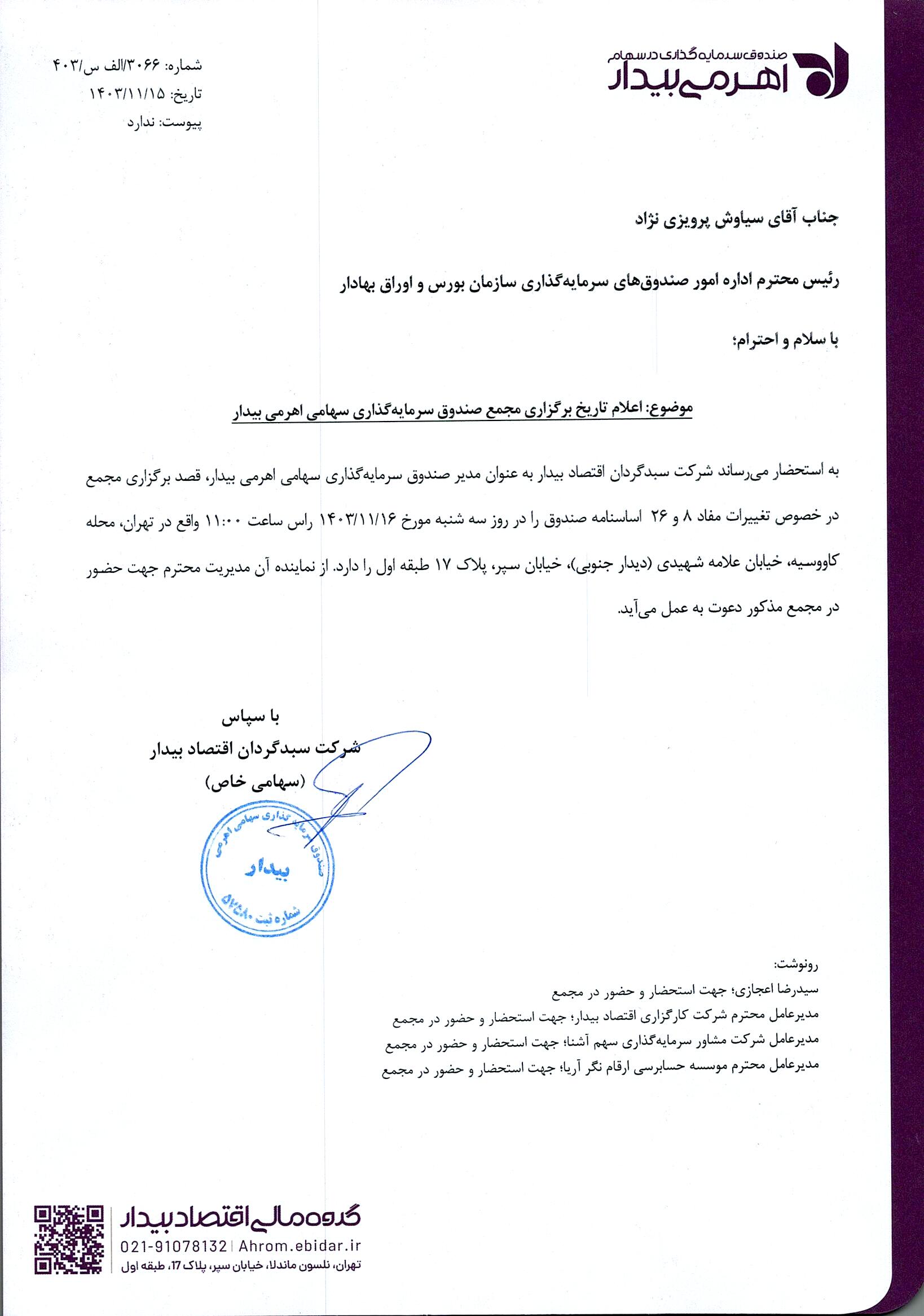 اعلام تاریخ برگزاری مجمع صندوق سرمایه گذاری سهامی اهرمی بیدار مورخ 1403.10.09